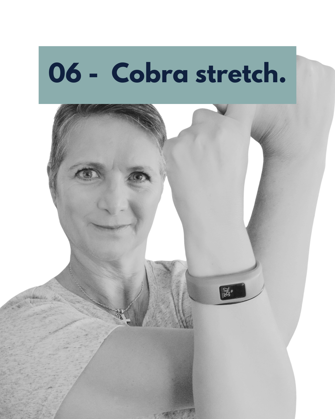 Grab your left thumb with your right pointing finger. If you find this too difficult, hold a small hand towel with both hands and continue the stretch.