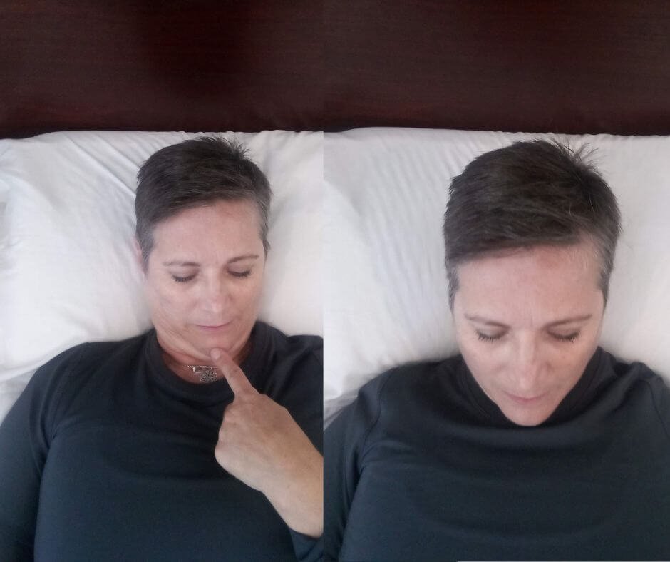 Before you start, ensure that the pillow you are using is high enough, so that you are looking down at your knees and not your chin facing the ceiling. If that’s the case, add another pillow under your head, so that your head is in the correct position to start with.