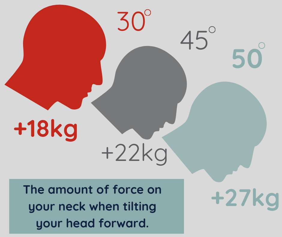 The graphic on the left shows the amount of force on your neck when tilting your head forward whenever you read a text or scroll through social media for hours on end.