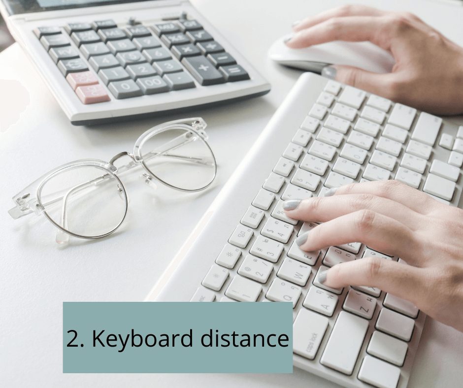Your keyboard distance should be close enough to your body so that your elbows are relaxed on the desk and your shoulders are relaxed.