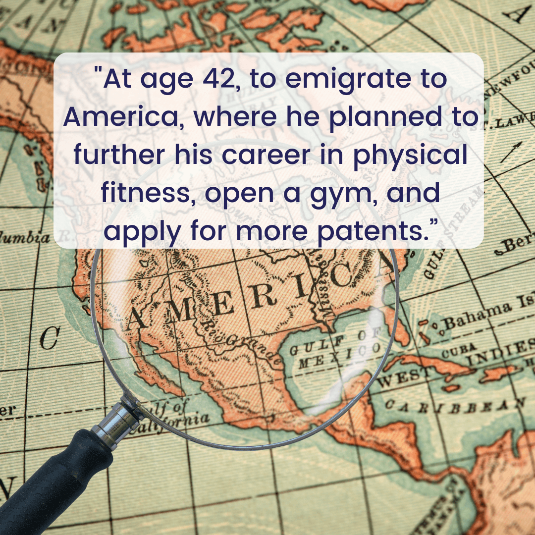 “At age 42, to emigrate to America, where he planned to further his career in physical fitness, open a gym, and apply for more patents.