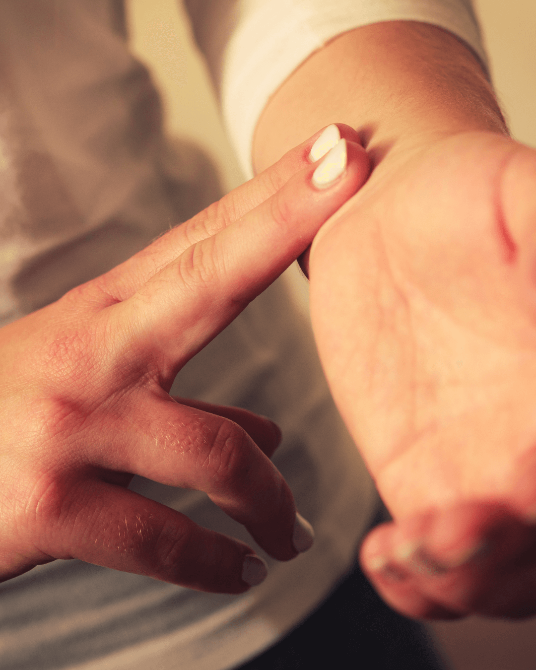 Pressing gently down, count how many beats you can feel for 15 seconds using a stopwatch or watch with a second hand.